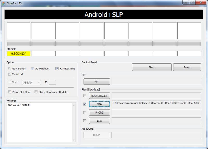 Hola, he seguido todos los pasos y Kies me reconoce bien el dispositivo, pero Odin lo detecta en COM 13 pero no sale ningun cuadrado de los grandes de arriba amarillo o verde, no me atrevo a seguir por si me lo cargo ¿esta bien o hago algo mal?