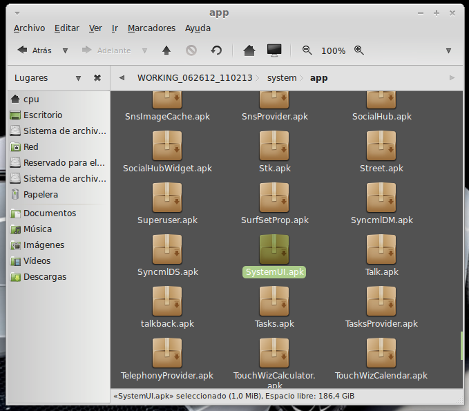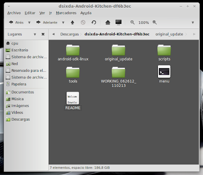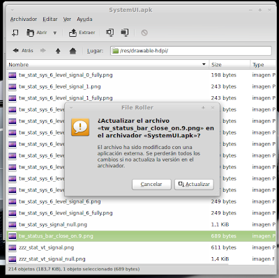 ...Continuación -Cambiar fondo de pantalla por defecto: Un cambio sutil pero efectivo, aunque podéis poner la imagen que queráis. Como siempre abrimos El WORKING_062612 Vamos a system Vamos a framework Abrimos framework-res.apk (se abrirá como si fuera un zip) Accedemos a la carpeta "res" drawable-hdpi Botón derecho sobre default_wallpaper.jpg Abrimos con el editor de imágenes GIMP Menú Colores y click en colorear (el 4º por debajo de la lista desplegable, no el 3º por arriba) Selecionamos blanco o el color que queráis y aceptar Cerramos gimp Claro, le damos a guardar. Es un archivo jpg, le damos a guardar sin modificar nada Y nos pregunta si queremos actualizar lo modificado y le decimos que sí, actualizar. -Personalizar algún icono: Los archivos .png no tienen ningún secreto, pero los 9.png sí. En esos no modifiquéis tamaños si no queréis complicaciones. WORKING_062612 Carpeta system Abrimos app Abrimos SystemUI.apk (se abre tipo zip) Directorio RES Drawable-hdpi Vamos a modificar el cierre del status-bar con nuestro nombre. Botón derecho sobre tw_status_bar_close_on.9.png, abrir con: Seleccionamos Editor de imágenes de GIMP Herramientas, selecionamos texto y escribimos nuestro nombre Cerramos dándole a guardar Como quizá hemos creado capas le damos a Exportar Y, como ya sabemos, actualizamos el ZIP -Os adjunto una carpeta con iconos que yo he personalizado. Son de libre utilización. ![]() Link de descarga iconos: carpeta iconos (sevidor Mediafire) Un consejo. Trabajar en modo RGB cuando el icono este indexado. Para cambiar de un modo al otro, dentro de Gimp seleccionamos el menú Imagen - Modo - RGB. Como ya dije: editar - guardar - firmar. Vamos a firmar: "0" para ir a opciones avanzadas y pulsamos Enter. Opción 22 y Enter Opción "a" y Enter ¿Firmar todas las Apks, incluso en data/app? pulsamos "y" y Enter. (está firmando de manera automática) Acabó. Enter para continuar. "x" para salir del gestor de firmas. Y "0" para volver al menú principal -Llegados a este punto solo nos falta un par de clicks y tendremos nuestra propia Rom cocinada al estilo del chef. Nos falta seleccionar los wipes y construir la Rom. -Vamos con los wipes: Seleccionamos la opción 7 y Enter para continuar ¿Queremos que haga wipes? Yo le doy a SÍ, independientemente de que los realicen desde el menú recovery antes de instalar la ROM. Por lo tanto "y" y Enter para continuar Vale, ya está cambiado, pulsa Enter para volver al menú principal. -Y ya, por fin, el paso definitivo: Construir la ROM. Seleccionamos 99 y Enter para continuar. Elegimos la opción 1. Enter para continuar. ¿Queremos zipaligning? SI! "y" y Enter para continuar (Zip aliniando y creando ZIP) Pulsamos "y" y Enter para seguir. Nos recomienda firmar y le hacemos caso. "y" y Enter para seguir. ¿Cambiamos nombre? ¡Sí! "y" y Enter para continuar. Escribimos el nombre, pulsamos Enter para confirmarlo y Enter de nuevo para continuar Finalmente pulsamos "x" para cerrar la cocina (gracias http://www.xda-developers.com) Se nos crea una nueva carpeta en nuestra cocina, se llama OUTPUT_ZIP Dentro de OUTPUT_ZIP esta nuestra ROM en formato ZIP. Se tiene que copiar tal cual a la carpeta que más te guste dentro de tu móvil, vía usb. Paciencia tarda unos minutos. A continuación la puedes instalar desde Recovery. Custom Roms SuperSinplomo por Victor Sin Plomo se encuentra bajo una LicenciaCreative Commons Reconocimiento-NoComercial-CompartirIgual 3.0 Unported.