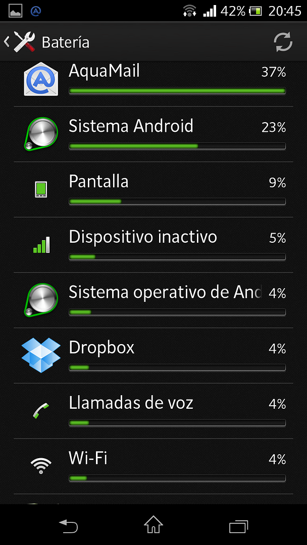 Com veis la que más consume es aqua mail... pero claro tengo todas mis cuentas en push, y os aseguro que consume 1/3 de lo que consume la apli nativa de JB...