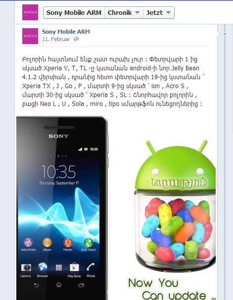 y os recuerdo que estos tenían planeado actualizarse a últimos de marzo, espero que sigan así y nos lo traigan antes también.Edito: Acabo de leer en los comentarios de Xperiablog que nuestro Xperia S actualizará aproximadamente para el 30 de este mes. Sacado de la página de Facebook oficial de Xperia Mobile de Armenia. ![]() Traducción con el traductor de Google (ya que está en armenio D): Cita:Estamos muy contentos con todas las noticias, de 1 de febrero para Xperia V, T, TL - para obtener el nuevo android-Jelly Bean 4.1.2 versión después de 19 de febrero recibirán un `Xperia TX, J, Go, P, 9 de marzo Dado que, ion, S Acro, 30 de marzo de, Xperia S, SL. Felicitaciones a todo el mundo excepto Neo L, U, Sola, miro, los titulares de pisos smartphone.