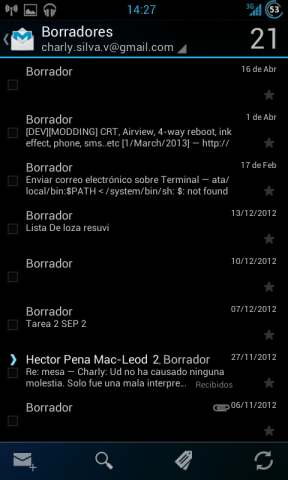 He hecho wipes y formats de todo menos la micro sd. Instalo Evil y no pongo la cuenta de Gmail. Configuro el aspecto y dejo la rom toda la noche tranquila. Le pongo esta mañana 4 contactos a mano (pensando en problemas de agenda y páginas de caracteres), pruebo bluetooth y conecta correctamente y aguanta, llama y recibe y todo bien. Lo conecto y desconecto varias veces, enciendo y apago teléfono y coche y sigue bien. Pongo mi cuenta de Gmail y a la porra.