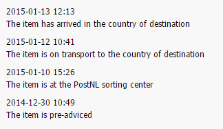 Número de envío: RS198623362NL Fechas Estados 09/01/2015 Salida de la Oficina Internacional de origen 20/01/2015 En proceso de entrega Nunca es tarde si la dicha es buena