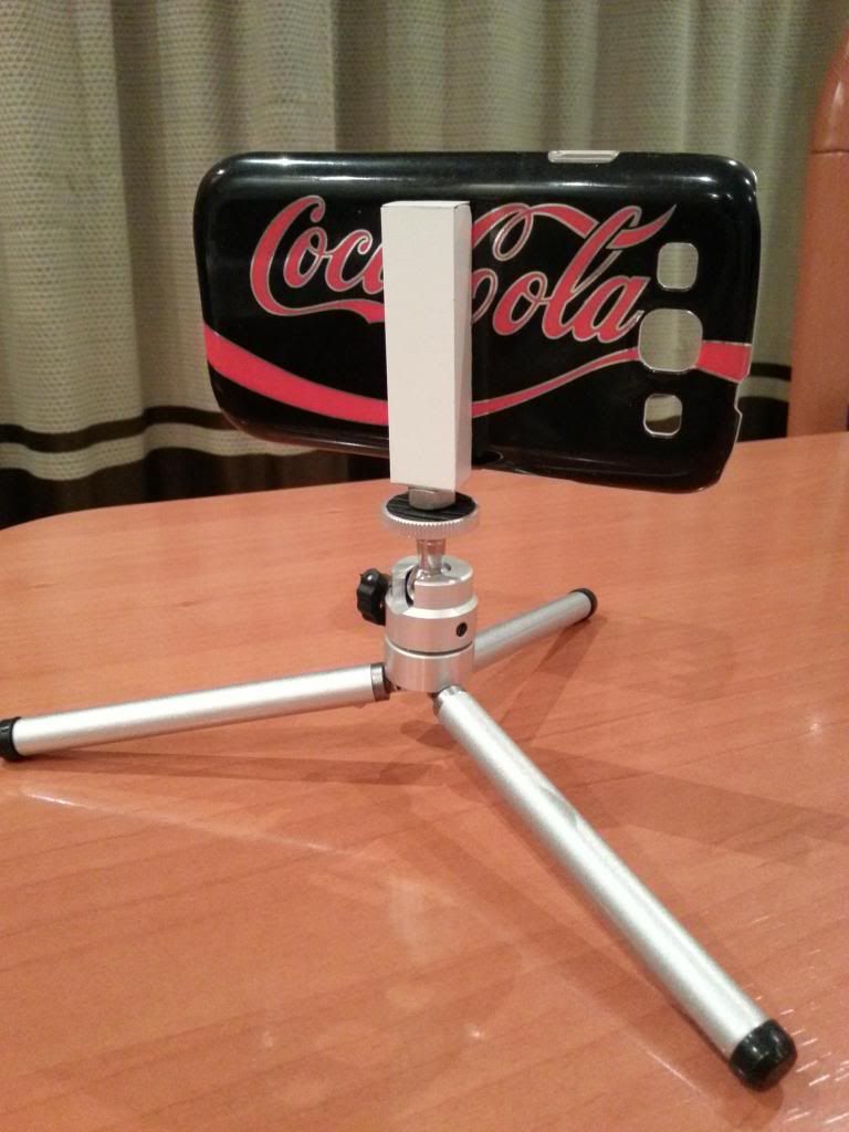 A quien no le sobra una tapa del movil, una tuerca y un listoncito de madera (el mini tripode ya lo tenia de un nivel laser )