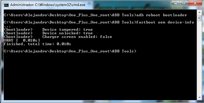 En cuanto presiono la tecla, tal y como me dice la aplicación, se cierra el programita pero el teléfono sigue constantemente en el estado de Fastboot Mode. Por la información que pongo en el pantallazo no soy capaz de decirte si está abierto o no. Sin embargo si uso el método que he encontrado en youtube (no pongo el enlace porque no sé si se permiten enlaces externos), que es uno que creo que es muy parecido al de aquí pero que usa instrucciones a través del Command Line, hay un momento en el que me pide introducir una instrucción para comprobar el estado del bootloader (en concreto la instrucción es "fastboot oem device-info") y haciendo eso obtengo el resultado que se ve en la siguiente captura: