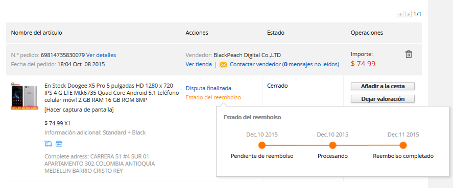 Bueno, se supone que pude sacarle un reembolso de 15$ al vendedor de aliexpress y según esto el reembolso ya está listo.