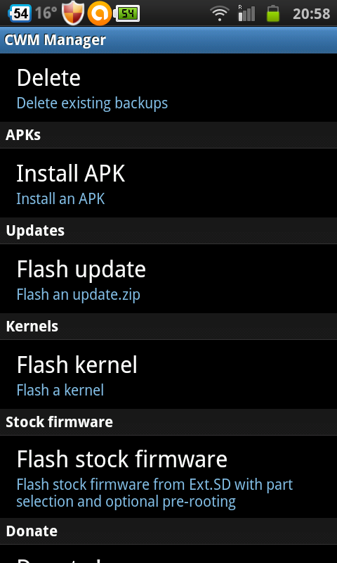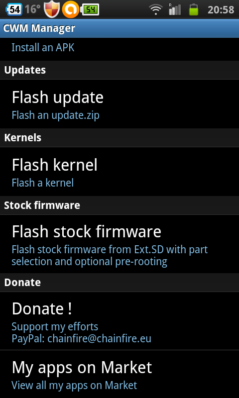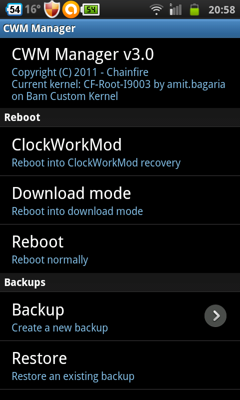 Yo no soy un experto pero me parece que esas opciones comentadas anteriormente aparecen en el CWM cuando reinicias el móvil en ese modo, no en la aplicación en si.