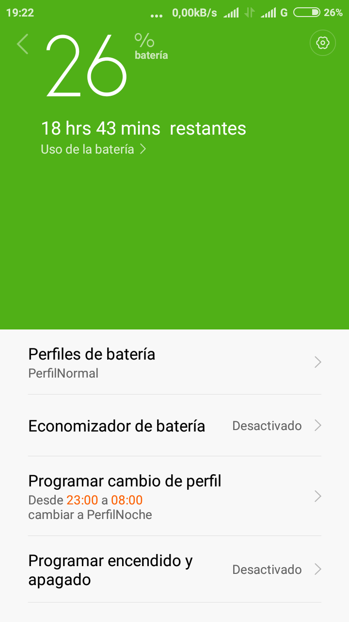 Tengo creado dos perfiles de batería, que me dejan el móvil en modo avión a las 23:00 y me activan el terminal a las 08:00 horas de forma automática.