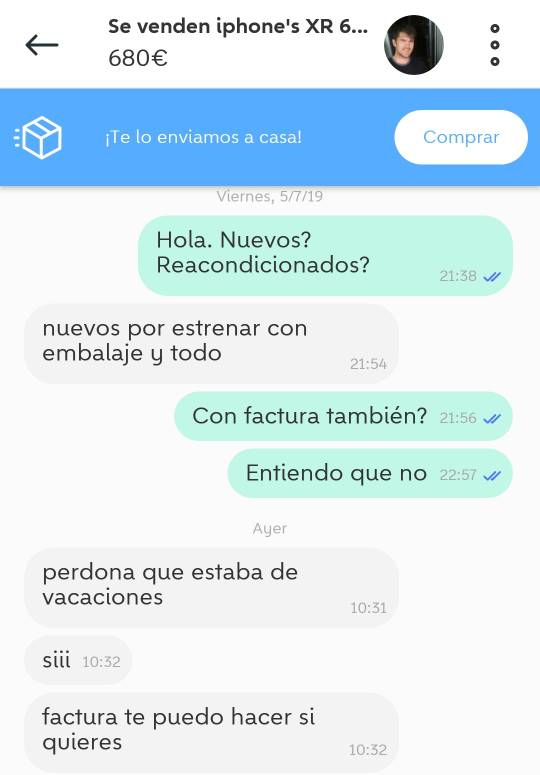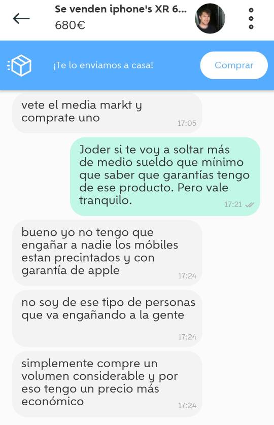 Encontré a un vendedor de Wallapop que vende iPhones XR. Soy muy de dudar con estos vendedores pero lo bueno es que puedo quedar con él y ver que el teléfono esté precintado. Son cerca de 100€ menos respecto al precio en Amazon. Qué os parece?Archivo Adjunto 1200910Archivo Adjunto 1200911Archivo Adjunto 1200912