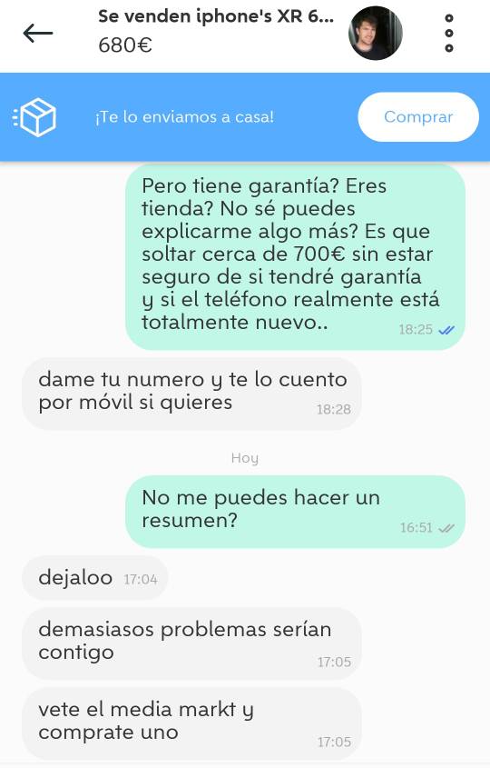 Encontré a un vendedor de Wallapop que vende iPhones XR. Soy muy de dudar con estos vendedores pero lo bueno es que puedo quedar con él y ver que el teléfono esté precintado. Son cerca de 100€ menos respecto al precio en Amazon. Qué os parece?