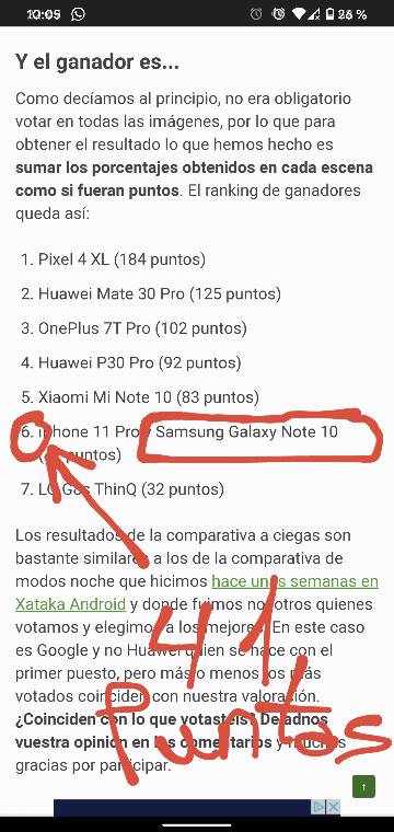 El Pixel 4 XL gana porque en un selfie nocturno ha obtenido el 80% de votos lo que le ha sumado 80 puntos de sus 184 totales. No obstante no gana en ninguna otra foto y se nota obviamente que Huawei es el claro ganador en todas las escenas salvo selfie.