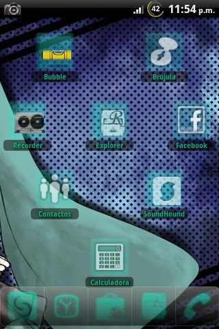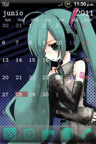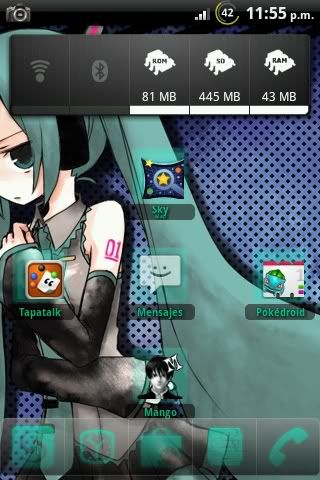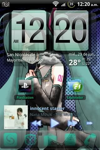 Hola, este es mi nuevo home basado en vocaloid, sigo usando adw launcher ex, ahora con el tema sense instalado desde el market de ahi son los iconos blancos, el reloj es weather & toggle, con tema htc modificado por mi para dejarlo verde, el reproductor sigue siendo power amp( no lo cambio por nada), el calendario tambien sigue siendo jorte muy bueno, el widget de estado es widgetsoid, el fondo de vocalid viene en un tema del adw con un pack de fondos.