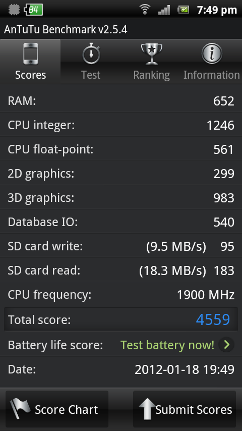 A mí me daba 3000-3100 con stock ROM. A lo mejor la tarjeta de clase 10 ayudaba:p