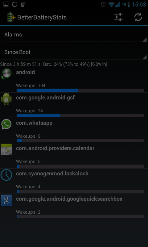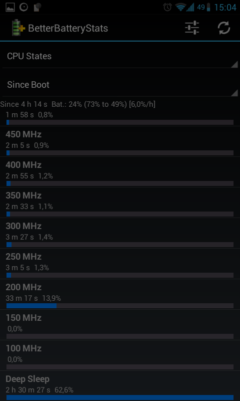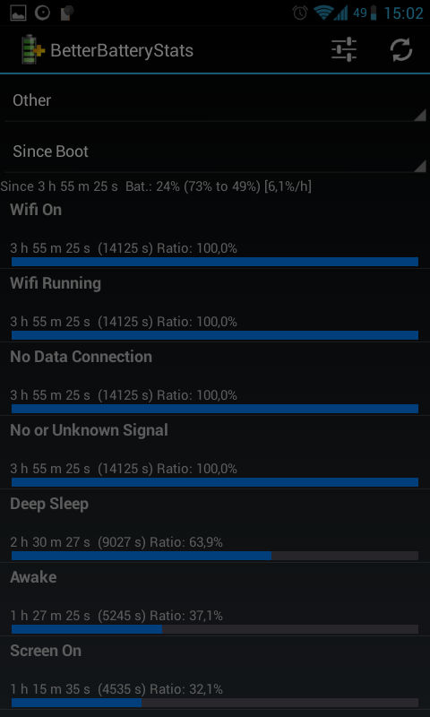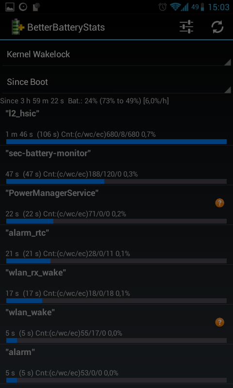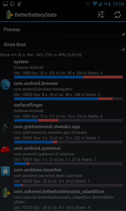 Aquí viene mi pequeño tutorial de cómo interpreto el Better Battery Stats. Hay muchos tecnicismos que no entiendo, así que puede ser que no sea correcto y me esté equivocando. Advierto también que no explico cómo funciona, ya que no lo sé ![]() Hay 5 pestañas: Other, Partial Wakelocks, Kernel Wakelocks, Alarms, Process. Nos interesan sólo Other, Kernel Wakelocks y Process. Dentro de estas pestañas podemos elegir tres referencias para empezar la monitorización: Since charged (creo que es cuando alcanza el 100% de carga), Since unplugged (por defecto) y Since Custom Ref. Yo uso "Since unplugged", es decir, empieza la monitorización cuando desenchufamos el móvil de una carga. También podemos usar "Since Custom Ref." añadiendo una marca desde donde va a empezar la monitorización (tecla menú -> more -> Set Custom Ref.), útil si, por ejemplo, cambiáis de modem pero no habéis cargado el móvil. La pestaña Other nos da tiempos, estando arriba del todo el tiempo desde que se empezó la monitorización. Estarán ordenados de menor a mayor y no creo que necesiten mucha explicación. Tiempo de pantalla, de deep sleep, con wifi puesto... La pestaña Process nos muestra los procesos que se han utilizado y el tiempo que han estado usando la CPU mientras estaban activas. Tienen nombres que no ayudan mucho, así que podéis mirar en Google y si tenéis suerte, sabréis a qué se refieren. La barra roja indica que el proceso ha sido llamado por el sistema, si es azul lo ejecutaría el usuario. Kernel Wakelocks es el más interesante. No sé interpretar las cosas, pero si pone "wlan" o "bln" (como me ponía a mí), entonces es la señal wifi o el programa bln los que están causando los kernel wakelocks. Ésto es lo que incrementa el uso de Android OS y drena la batería. Para el resto pues lo mismo, tirar de Google a ver si da más información. Mención especial al widger 2x2, con tiempos desde que se desenchufó, deep sleep, en uso, pantalla, kernel wakelocks (kwl) y partial wakelocks (pwl). Aquí es donde comparo el tiempo de kwl con el total (since) y en uso (awake). Hasta aquí lo que hago yo con el Better Battery Stats. Si está algo mal (que no me extrañaría) agradecería a quien supiera que me corrigiera, así todos aprendemos. |