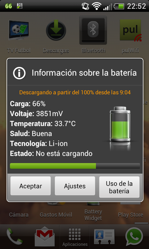 He desconectado el cargador a las 9:15 de la mañana estando toda la noche cargando y desenchufándolo al 100%. Añado que no he tenido un uso demasiado intensivo del móvil, con tres llamadas de teléfono (8 minutos entre todas), ver y contestar unos cuantos guassa y ver tres correos (o sea, un uso muy light). Pues bien, ahora mismo, tras 6 horas y 20 minutos, la batería está al 95%, siempre bajo cobertura 3G y/o WiFi
