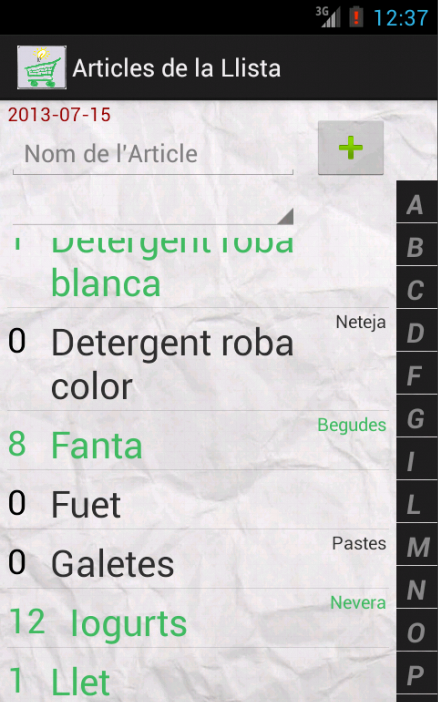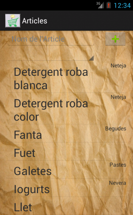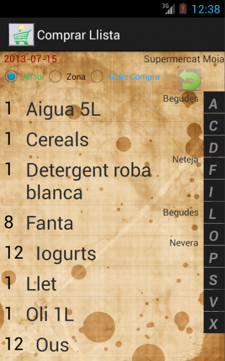 En GooglePlay las tienes, pero aquí te mando algunas: Menu: Crear Artículos: Poner artículos en una lista: Comprando: Es una App que pretende ser simple pero practica. Sin complejidad pero con todas las facilidades para ir rápido cuando se elabora una lista de compra, o cuando se está comprando, por eso he puesto una barra lateral con las posibles iniciales de los artículos para situarte rápidamente en el deseado, o por ejemplo cuando se está creando una lista se pueda crear des de la misma pantalla un artículo nuevo sin necesidad de ir a otra pantalla. Lo que a mi me es súper práctico es poder ordenar por orden de compra cuando se está comprando, ya que suelo ir siempre a los mismos supermercados y suelo hacer el mismo recorrido. Espero que os sea útil!