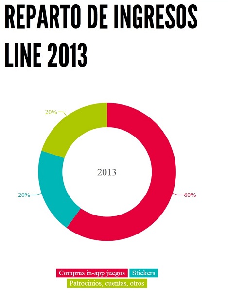 "En el juego de las compras fueron el principal motor de los ingresos del servicio de mensajería en el Q2 (segundo trimestre) de 2013, aportando el 53 por ciento en total (aproximadamente 53.700.000 dólares), seguido de las comprasde la etiqueta (stickers) engomada en el 27 por ciento (unos 27.400.000 dólares). Pegatinas patrocinados componen el resto de los ingresos de LINE".