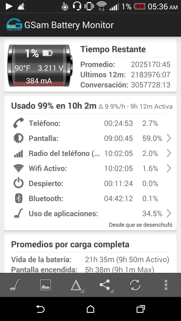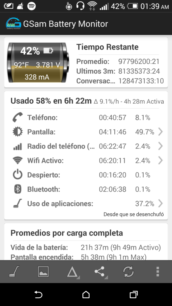 La aplicación del sistema operativo no dice el uso de pantalla... Ósea de que vale que vean si duro 1 día y medio pero no se sabe cuánto de ese día estuvo la pantalla encendida?Aceptenlo, yo le he sacado 9 horas de pantalla y punto ... Ahora mismo estoy viendo una película que baje,cuando esté llegando a cero subo foto.... Ahora mismo le quedan 62% y tiene 3 horas de pantalla.. Por donde quiera que lo vean el m8 tiene mejor autonomía de batería que el gs5...