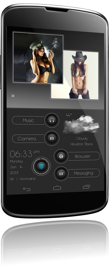 Google Music, Camera, Screen Off (al tocar en el icono del clima al teléfono se le apaga la pantalla) para esto necesidad descargar una aplicación que se llama Screen Off, Reloj, Calendario, Teléfono (icono azul. Al rededor tiene un marcador de batería en forma de círculo de color gris), Internet y Mensajes.