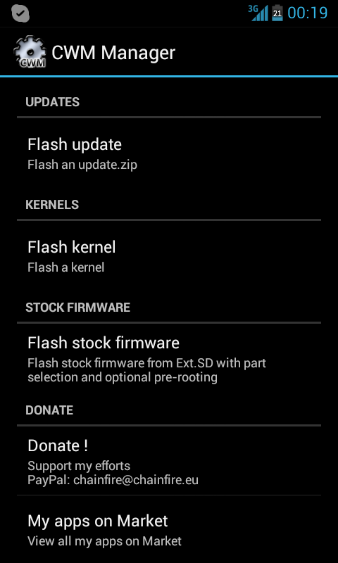 - Descomprime del zip de la versión v0 el archivo "zimage" y colocalo en un lugar fácil de encontrar dentro de la memoria interna del móvil. - Abres CWMManager y seleccionas flash kernel (adjunto pantallaso) ![]() - Buscas el zimage, pulsas aceptar y el móvil se reiniciará. Lo acabo de probar, y funciona perfectamente. Otra opción es usar el Mobile Odin. Pero el CWMManager ya lo deberías de tener ahí... Espero te sirva. Última edición por devil_1210 Día 07/02/13 a las 04:49:47 |
