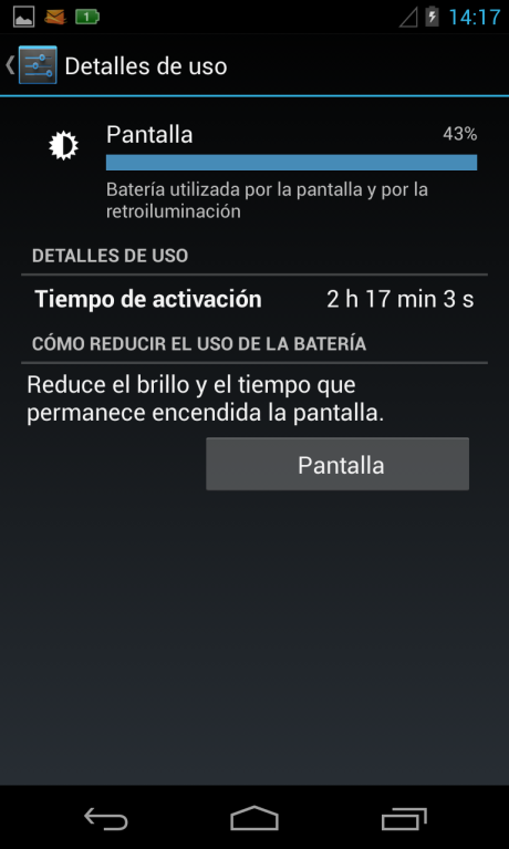 Todo como viene de fábrica, sin root ni nada. No he desactivado nada. 3G, wifi, etc. Únicamente sin GPS (solo cuando lo pide alguna aplicación) y sin google Now (porque no le saco provecho). Me dura la pantalla 2h 30min más o menos. con unas 18h de funcionamiento Que quiero poner un pantallazo de 6h de pantalla, o más, y con dos días de batería: 1.- Uso menos el telefono 2.- No apago la pantalla. La dejo encendida y me sube el tiempo de pantalla la de dios... Y así puedo fardar de mi super batería que me ha venido con vitaminas a tope. Pero seamos sinceros, uso el teléfono mogollón. Para llamar, internet, facebook, flipboard, whatsapp, mail, evernote... constantemente Y estoy contentísimo con la batería, la pantalla y el teléfono en su conjunto. Si queréis pongo un pantallazo de uso normal para mí. Y luego otro con una duración de pantalla de más de 6h. Es fácil. |