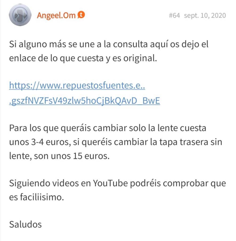 ![]() La tapa trasera completa con lente de cámara sale en 50€, que no es mal precio. También se puede cambiar sólo la lente y así no quitar la tapa trasera (es más recomendable para que no pierda el ip68). De todas formas mucho cuidado al quitar el cristal de que no se meta ningún cristalito en las cámaras y sea peor el remedio que la enfermedad. Suerte con la venta.