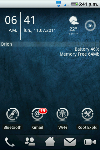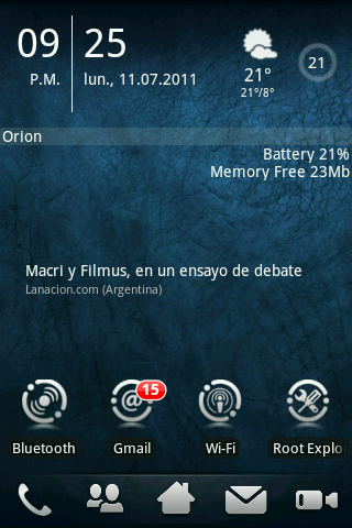 Bueno, yo ya casi me estoy retirando de todo, la verdad que la pase muy bien probando ROMS,aplicaciones,matando mi celular y reviviendolo jaja, pero esta es la parte en que llegas al final de la carretera, donde ya no queda nada mas por hacerle a tu celular (xq ya le hiciste DE TOOODOO =P) y yo ya estoy llegando a eso jeje. En las fotos, Home de Xperia x8.2.3 CypressTouch ADW Launcher con iconos de fondo de colores. Widget de Sense Analog Small Widget de Control de Energia y 2 Widget de Interruptores Wi-Fi y Bluetooth. Widget de CloudyBar con iconos de iPhone (Homenaje a Steve Jobs) puestos recientemente Barra de Accesos Directos de 5 iconos de ADW Launcher. es todo, asi lo quiero, y asii lo dejo! =) Gracia al foro de HTCMania, son los mejoress!!! y por responder TODASS, TODASSS mis preguntas ;)...igual OJO! no me voy, si yo siempre ando por aca! jaja =P