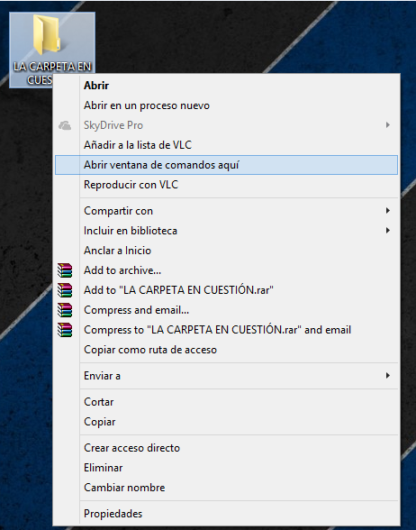 Descomprimes el .rar y con la carpeta que se te ha descomprimido y mientras pulsas el shift(tecla en el teclado con forma de flecha mirando para arriba, entre el control y el bloq mayus.) haces click derecho en la carpeta, te saldrá una cosa así: