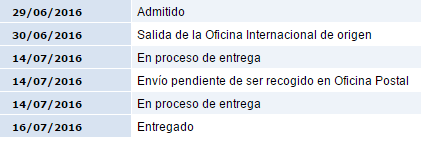 Fechas Estados 15/07/2016 Admitido 17/07/2016 Salida de la Oficina Internacional de origen 27/07/2016 En tránsito Eso es normal, no se cual es la diferencia entre admitido y pre-registrado pero a veces ponen una cosa y otras .... ![]() ![]() --------------------------------------------------------------------------------------- ![]() Este es de una empresa española (OSCARO creo)