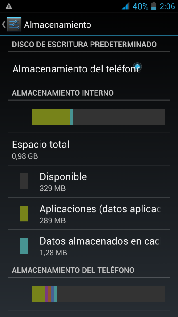 Para que te hagas una idea de lo que te digo. En Almacenamiento disponible me pone que tengo 320 megas, y en datos de aplicaciones 300 megas (todo esto de la memoria interna del telefono).