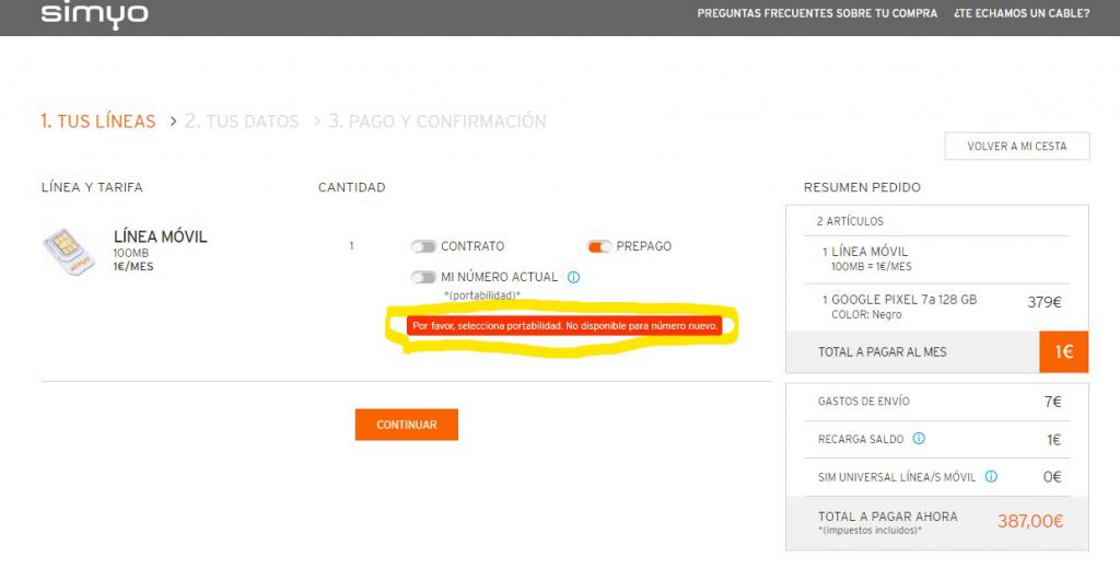 Sí añades una línea de 1 euro, que es lo que dijo el otro forero que había que hacer, no te permite que sea nueva sino que te obliga a hacer portabilidad. No se si hago algo mal, que puede ser, o si a lo mejor, sospecho que a lo mejor viendo la estrategia de la gente de añadir lineas de 1 euro para poder acceder al precio del movil, y lo quitaron temporalmente de stock hasta que cambiaron la web para no permitirlo. |