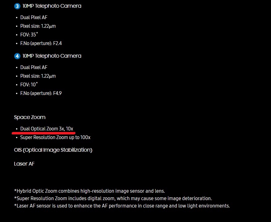 Porque me imagino que lo habrás leído. Ya se que hay webs que ponen que es óptico, tb otras que lo cuestiona. En las specs de la web de Samsung dice una cosa, y en la letra pequeña otra, igual que hicieron en anteriores modelos ![]() En las de Samsung USA, Latinoamérica, Corea, etc cualquier país pone óptico en las de presentación, specs y compra. Luego igual todas las webs que sean fiables. La letra pequeña dice lo mismo, X10 óptico. Si todas ponen que son 2 sensores telefoto uno 3X y otro 10X ópticos incluso las de Samsung España menos una, no crees que es porque es una errata o crees que el 99.9% restante que dice ser óptico son los equivocados? |