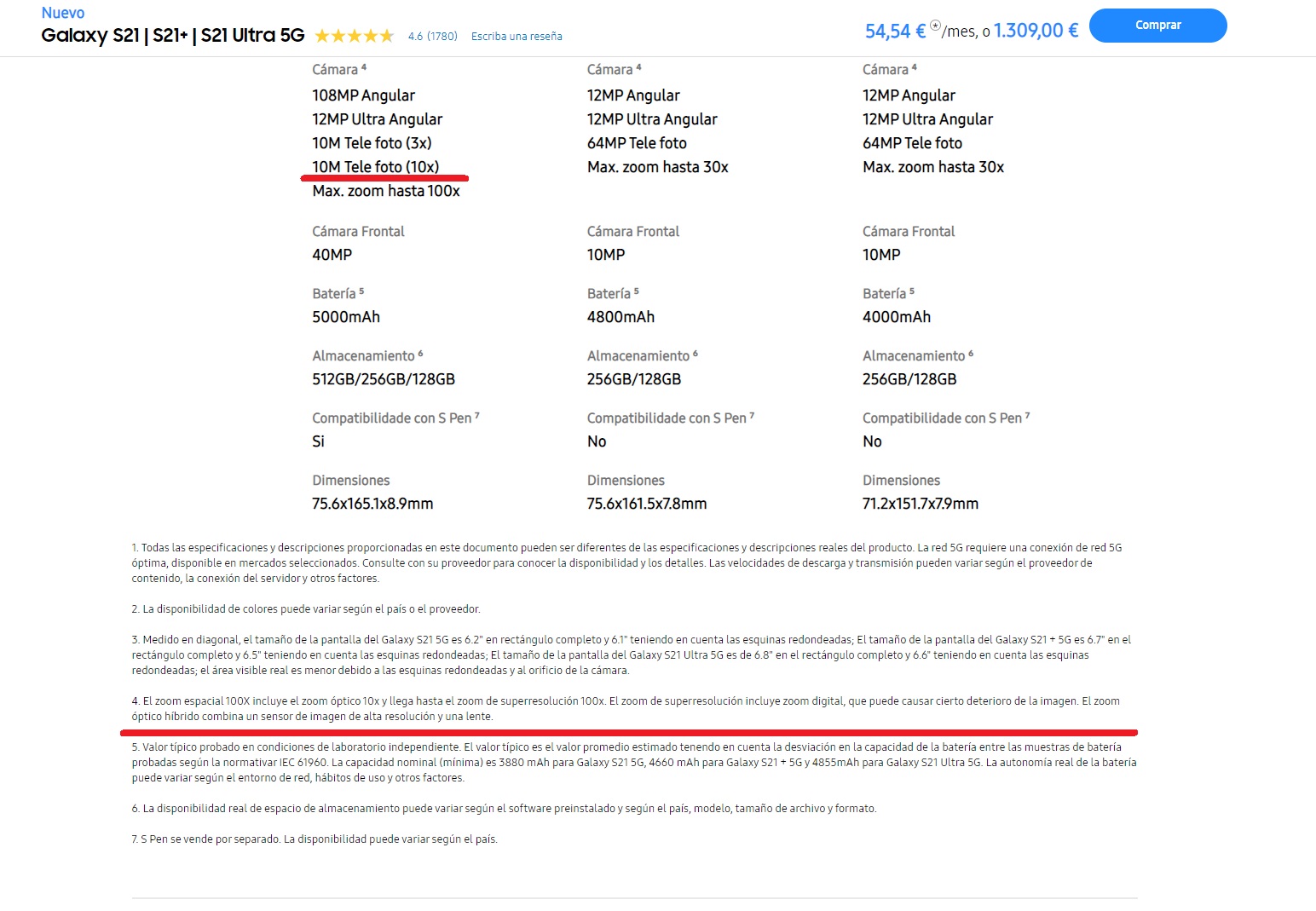 En las de Samsung USA, Latinoamérica, Corea, etc cualquier país pone óptico en las de presentación, specs y compra. Luego igual todas las webs que sean fiables. La letra pequeña dice lo mismo, X10 óptico. Si todas ponen que son 2 sensores telefoto uno 3X y otro 10X ópticos incluso las de Samsung España menos una, no crees que es porque es una errata o crees que el 99.9% restante que dice ser óptico son los equivocados? ![]() En kimovil tb ponen como híbrido, aunque yo de estos si que no me fio. Me fio de la web oficial de España. Que esta mal, bueno tengo mis dudas de que este mal. |