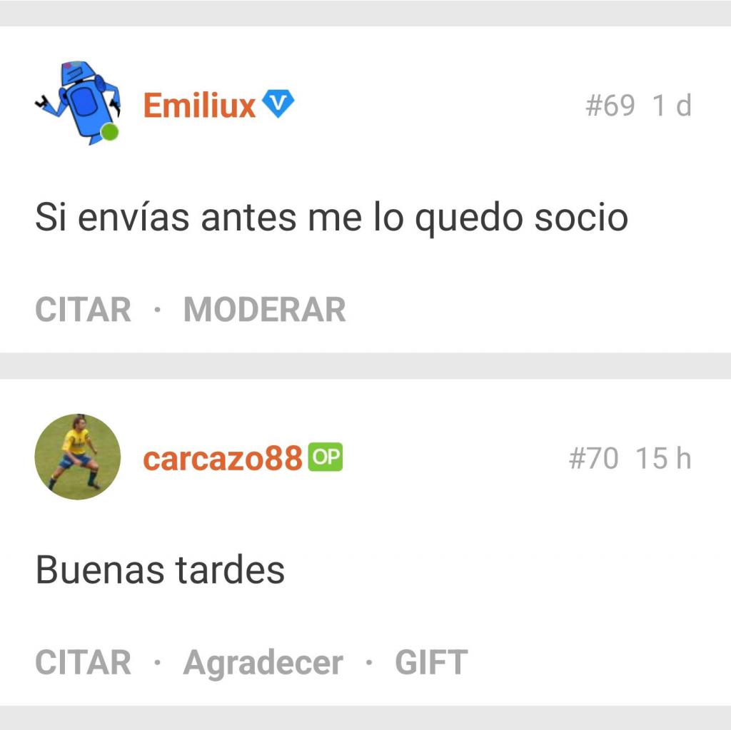 Lo mínimo que podría hacer el usuario es contestar si se me escribe en el post. Hay te dejo la captura donde le pongo que si envía antes me lo quedo pero el pasa de contestar con un simple No le hubiera bastado... Venga que por lo que veo esto del foro de compra y venta cada día se degenera más! Un saludo. |