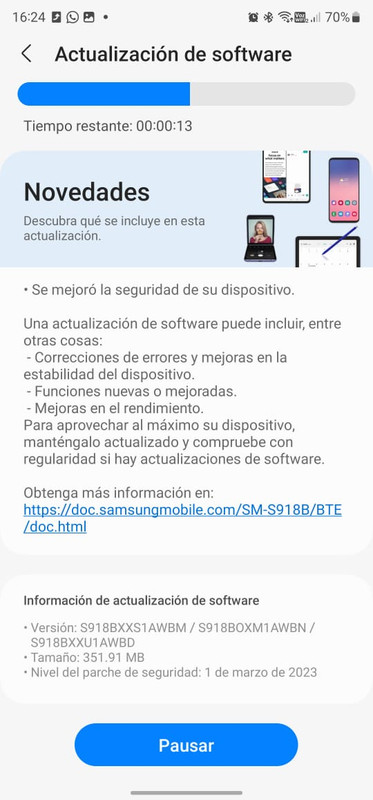 No se si conocen el sitio, pero acá deben fijarse cuando ya se encuentra disponible la actualización de acuerdo a su CSC: https://samfw.com/firmware/SM-S918B Ingresan a ese sitio, seleccionan la región a la que corresponde su CSC y les indica si ya fue lanzado y cuál es el último firmware disponible para esa región. En tu caso @juymelc para India aún figura como la última la de febrero. |