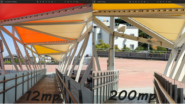 Y lo del "zoom" no es hacer zoom,es que cuando se abre la foto a 200mp en Windows,lo hace al 17% de su tamaño y si la pones al 100% entonces ves los detalles bien definidos.Mas alla del 100% entonces ya se difuminan.Esto es a lo que me refiero.Foto grande o foto pequeña,nada mas. En esta captura de pantalla muestro lo que quiero decir y en la de la derecha de 200mp solo se ve una parte de la foto,no hay que hacer mas zoom porque se ve todo perfectamente,cosa que con la de 12mp no ocurre,si intentas ponerla al mismo tamaño entonces se ve borrosa. Si para ti no es importante,pues nada,son tus gustos.Pero calificar una foto de buena o mala solo por verla al tamaño en que se te abre en el telefono y solo te fijas en los colores,no es en lo que yo me fijo,porque los colores se pueden editar luego y dejarla a tu gusto,cosa que con la resolucion no pasa.Hay apps que la suben de resolucion,pero no es igual que nativamente.Aparte que depende en que pantalla se vea...Una Oled?IPS?VA?etc. Aparte que en el Galaxy te puedes instalar la Gcam y ya tienes otro procesado de imagen diferente a la app de Samsung. Pero tu lo has dicho,para gustos hay colores,nunca mejor dicho.