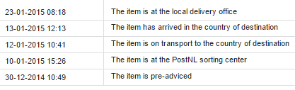 Hay uno que aun no me llega y lo compre el 04-12 esta desde el 13/01/2015 como Salida de la Oficina Internacional de origen. COMPRADO EN GEARBEST EL 13-12-2014 WEB CORREOS 10/01/2015 Salida de la Oficina Internacional de origen 22/01/2015 En proceso de entrega 22/01/2015 Envío pendiente de ser recogido en Oficina Postal 22/01/2015 En proceso de entrega 22/01/2015 En tránsito 22/01/2015 En proceso de entrega 23/01/2015 Entregado 2015-01-23 00:00 Delivered 2015-01-22 11:05 The delivery of the item was unsuccessful 2015-01-22 08:05 The item is at the local delivery office 2015-01-10 00:00 Dispatch from the point of origin international office 2015-01-13 12:13 The item has arrived in the country of destination 2015-01-12 10:41 The item is on transport to the country of destination 2015-01-10 15:26 The item is at the PostNL sorting center 2014-12-30 10:49 The item is pre-adviced COMPRADO EN GEARBEST EL 04-12-2014 WEB CORREOS 19/01/2015 Salida de la Oficina Internacional de origen 22/01/2015 En proceso de entrega 22/01/2015 En tránsito 23/01/2015 Entregado 2015-01-23 00:00 Delivered 2015-01-22 14:48 The delivery of the item was unsuccessful 2015-01-22 07:57 The item is at the local delivery office 2015-01-19 00:00 Dispatch from the point of origin international office 2015-01-19 09:46 The item is on transport to the country of destination 2015-01-19 07:51 The item is at the PostNL sorting center 2015-01-15 08:25 The item is pre-adviced |
