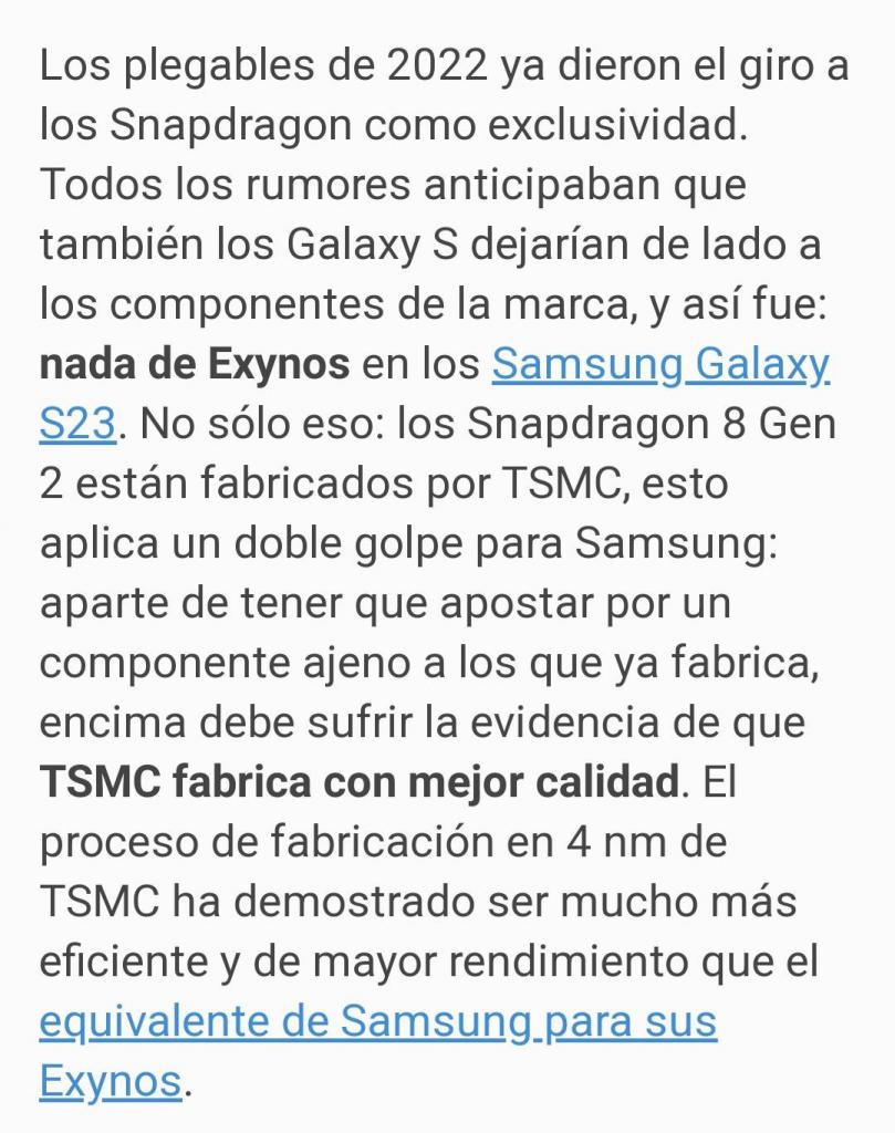 Un artículo que no ofrece un sólo dato que apoye lo que no deja de ser una opinión del articulista (dice que los sd 8g1 son "mucho más eficientes y de mayor rendimiento" que el exynos 2200) y mucho menos habla del cierre de la fábrica de procesadores exynos por una remodelación profunda de cara a los 3nm.