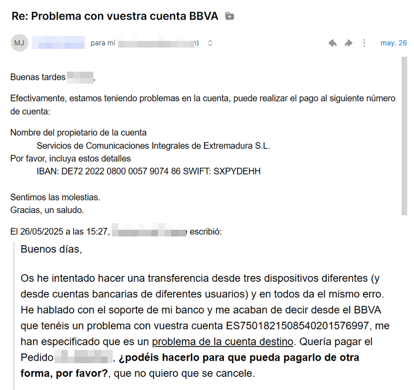 Llevo muchísimos mails escritos y el pasado 27 de junio me escribieron indicándome exactamente lo siguiente: "Le informamos que actualmente estamos teniendo problemas con la entidad bancaria por cambio de la misma."