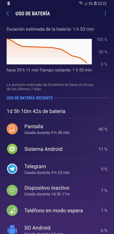 ese consumo es medio regular. pero tampoco esta tan mal. depende mucho de la cobertura de tu zona. de si usas mucho wifi o mas datos , ESTO es importante. ya que las variaciones en la cobertura en 4g y 4g+ gastan una barbaridad! mas de lo que os pensáis. cuando lleguéis a casa,es mi consejo... coger y ponerlo en 2g y el wifi que no sea el plus de 5gz hay muchos problemas con los routers con consumo en estos aspectos. pero ya cada uno que haga lo que quiera.!! eh!! jejeje desactivando apps y bloqueando notificaciones innecesarias yo llego a 1 día y medio con 7 horas de pantalla.aproximadamente. hay algunas veces que no llego a 6 horas y 20 por ahi... y nunca bajo para cargarlo del 20% restante de batería. la carga de la batería la cargo con carga rápida un dia y cuando se vaya acabando la otra con carga normal mas lenta. para que siempre los iones del litio de la batería estén activos... que parece una tonteria pero hay muchos estudios y comentarios de cocineros importantes en xvda que dicen lo mismo, por el simple echo de que el calor producido por las cargas rapidas degeneran muy mucho las baterias. tambien otro truquillo seria cargarlos sin funda ya que ciertas fundas hacen que no disipe bien el calor al cargarse. a día de hoy llevo la PHE española con compilacion de octubre y va perfecta en consumo. es un mechero. sin mas... perdonar por el tocho es una pequeña explicacion de lo que suelo hacerle siempre a mis moviles y nunca e tenido problemas de bateria respecto a moviles SAMSUNG. Última edición por carlos230123 Día 05/11/18 a las 16:44:12 |