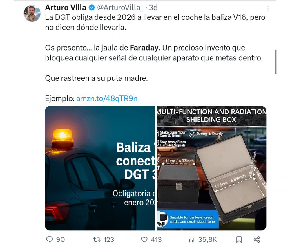 que no hay estafa? jajajaja? lo primero que ya casi todos o la mayoría de vehículos tienen boton de emergencia, o incluso de piñazo fuerte se activa la llamada automáticamente, si te pegas un piñazo fuerte, quien va poner la baliza encima del vehículo, la virguen de guadalupe?, tb la va a activar?, tb te llamar a emergencias, ¿?, todo el mundo tiene telefono movil, (smartphone) y quieras que no, aunque tu apagues el telefono, tb esta localizdo, quiero decir que si estas tirado en la carretera, llamas con tu movil a emergencias, la baliza en días claros a plena luz no la ve ni el tato de lejos, a no ser que sea una baliza como las que llevan los tractores esas grandes, claro que se conectan a la dgt, cuando das de baja un vehículo tienes que darlo de baja en la dgt, por lo tanto es un timo por los lumbreras de turno (dos exguardiaciviles retirados) y en conveniencia con la dgt y el gobierno por supuesto, para que en la mayoria de lso casos los coches que se van a averiar en carretera el 60 por ciento van a ser coches con muchos años, coches que por cierto contaminan menos que los nuevos, aunque sean gasolinas o diesel, pero claro quieren que la gente cambie de coche cada 5-6 años, y los coches antiguos con el timo del cambio climatico, quitarlos de enmedio literalmente, por lo tanto la dgt sabrá la edad de tu vehículo, y fijo que estarán detras de ti porque tu coche ya tiene entre 15 y 20 años y mas de 20 años, (55-60 por ciento del parque automovilistico nacional, vehículos de entre 15 años y 20 años y mas de 20 años, es decir un negociazo) y bien cuidado anda aun como la seda, peeeero tienes que cambiar de coche porque asi lo dice el timoclimatico, mas de 500 milones en iva por la compra de las lucecitas, que es otra cosa, porque no te pregunta donde van los mas de 11.000 millones de euros en los presupuestos supuestamente para arreglar autovias y red de trafico de españa?, que dan PUTA VERGÜENZA AJENA, como estan las autovias llenas de vaches, y las comarcales nacionales ni te cuento.... BUENO SI para PUTAS, COCA, GAMBAS, MENAS, MINISTROS, ENCHUFADOS, MOROLANDIA, CAMPAÑAS DE DES-IGUALDA, ETC... lo que tienen que hacer es gastar bien el dinero de los impuestos y no despilfarrarlo y lapidarlo, entonces veríamos como no hacía falta tanta tontería. (lo digo por todos los partidos políticos en general-gobiernos)