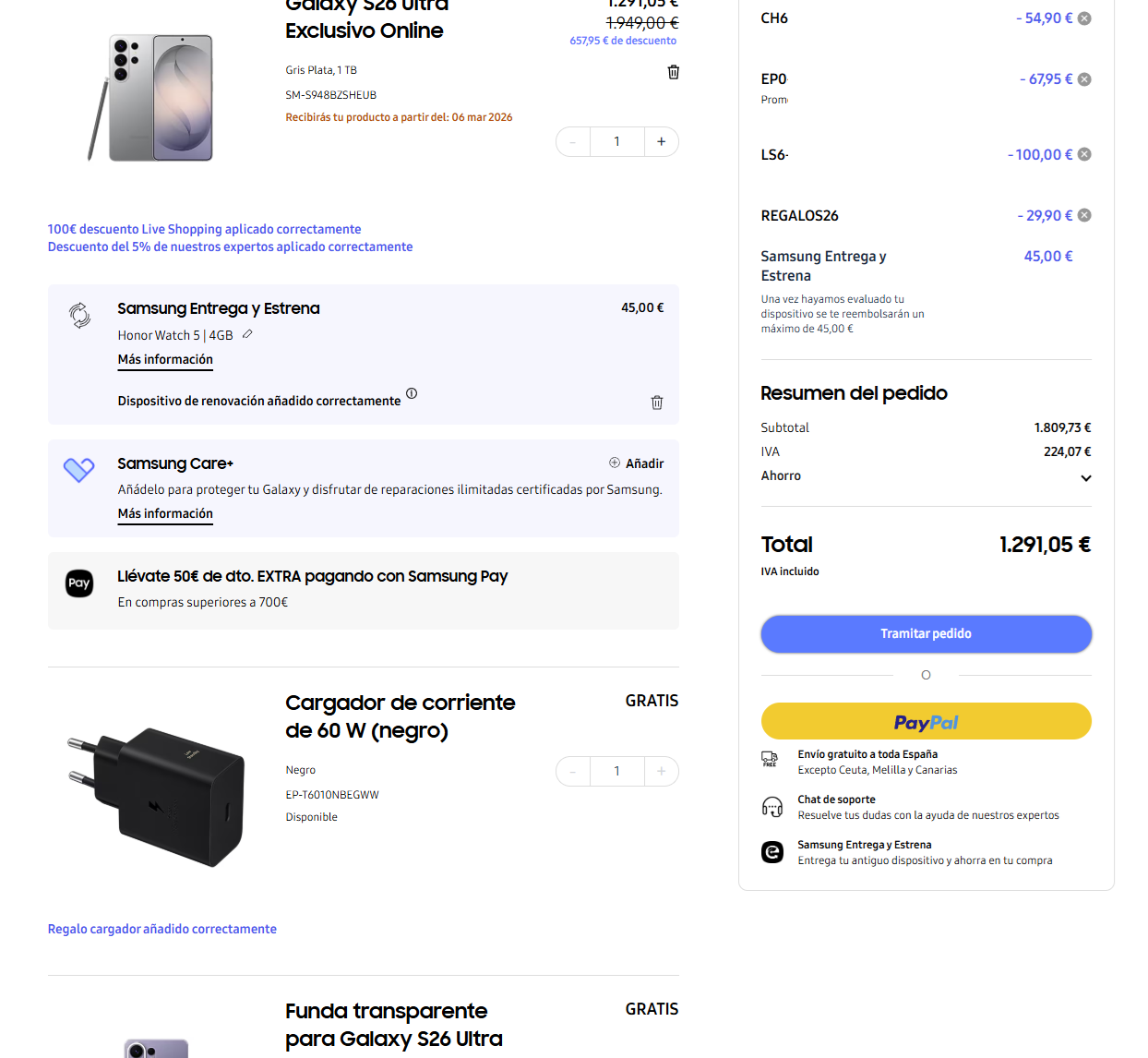 s26 ultra con funda, buds 4, 1438 me sale....sigo intentando bajar el precio