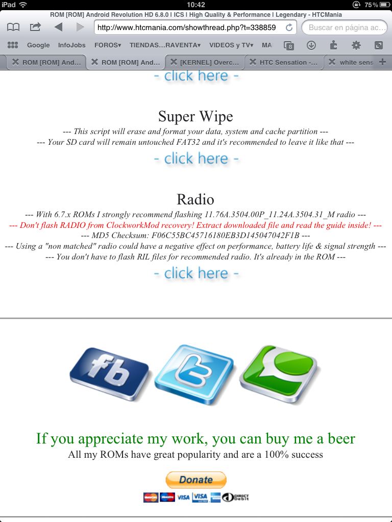 Pero ahora me entran mas preguntas: 1/- Con instalacion limpia te refieres ha hacer fullwipe y instalar de nuevo la rom, o ademas de ello instalar otra vez la firmware y la radio? 2/- Que firmware se utiliza para esta version de ROM para ver si es igual al que utilizo yo y en caso contrario de donde me lo podria bajar? Un saludo y gracias de antemano ;) ![]() http://www.htcmania.com/showpost.php...53&postcount=9 |