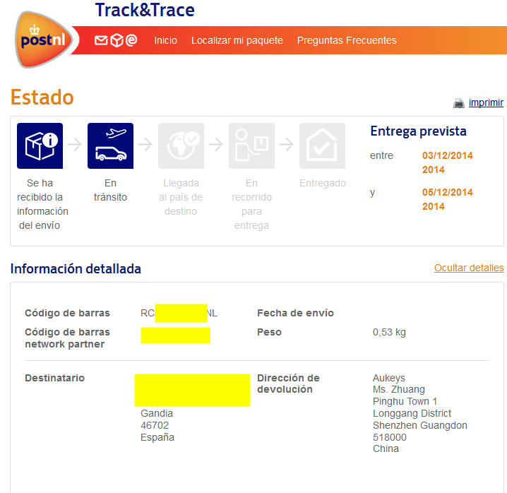 Pues me indica "Paquete no encontrado" Pongo el pais de destino (España), el codigo postal y el numero de seguimiento donde dice "codigo de barras" y me indica:
