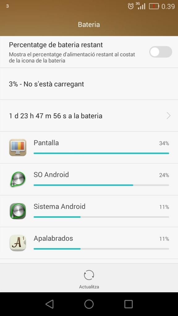en 14 horas horas, me dio estos resultados de pantalla, trabajando con 3g y Bluetooth, en casa con WiFi, sólo me dio tiempo a esa captura porque me salió el mensaje de que en 30 segundos se apagaría el móvil