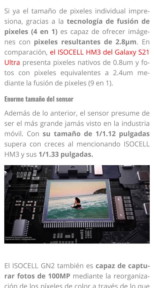 Creo que eres tú quien ha entendido mal mi mensaje. No he establecido relación entre el número de pixels y la calidad del vídeo; solo he dicho que el HM3 tiene mayor cantidad de pixels y sobre el papel mayor calidad de vídeo, sin insinuar de ningún modo que exista causalidad entre ambas variables. Y lo he afirmado porque así lo indican las especificaciones de ese sensor publicadas por Samsung en su web oficial, que ponen que el HM3 soporta grabación 8K a 30 FPS, 4K a 120 FPS y FHD a 240 FPS. De todas formas esto último no me parece relevante, ya que obviamente la calidad final del vídeo depende mucho del SoC y de otros factores.