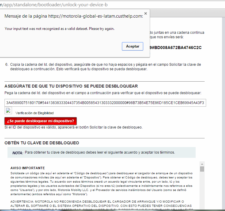 Hola amigos tengo un problema al liberar el bootloader, ya había desbloqueado uno anteriormente, el problema esta que cuando introduzco el código en la pagina de motorola me marca el siguiente error ya lo hice varias veces ya me fije que no cometa ningún error pero siempre el mismo error, ¿alguna solución? Gracias