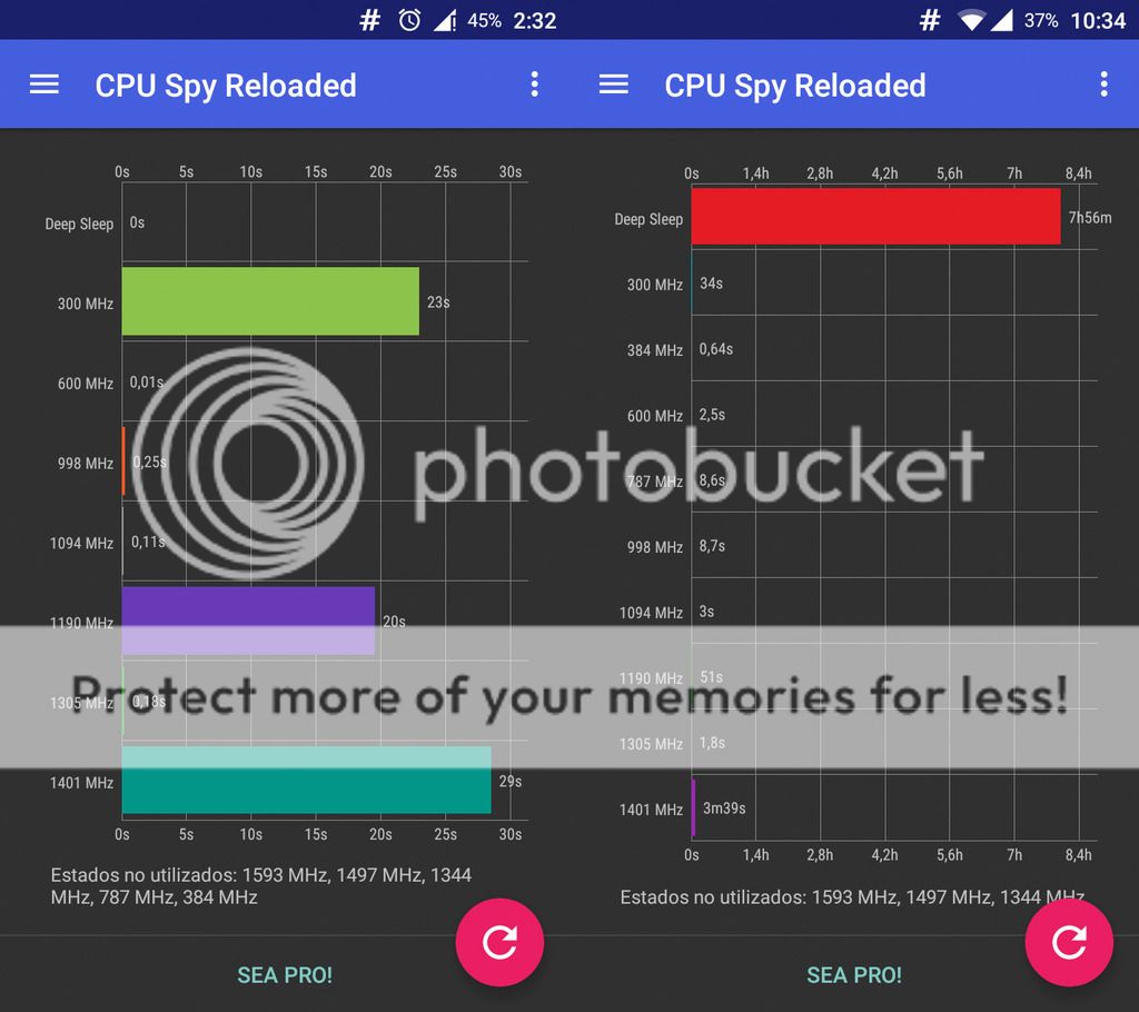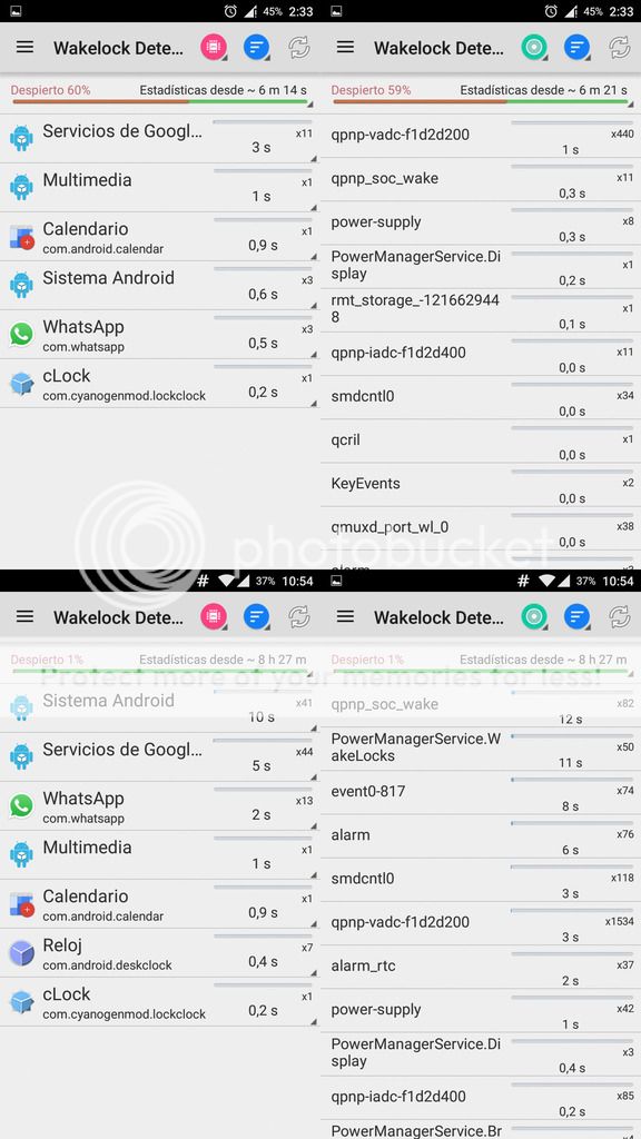 He probado esta noche la nueva boot.img y estos han sido los resultado de consumo de batería en deep sleep, creo que han mejorado poco o nada. Lo raro es que en CPU Spy y wakelock no se detecta nada que hubiera estado consumiendo tanto como para llevarse ese 8% de batería (quizás con la llegada de Android M se solucionen más los consumos en deep sleep con su modo Doze). Al grabar video parece que no falla pero no sé si es porque ahora hace tiempo más fresco, la CPU justo después de grabar no está a más de 45 grados.