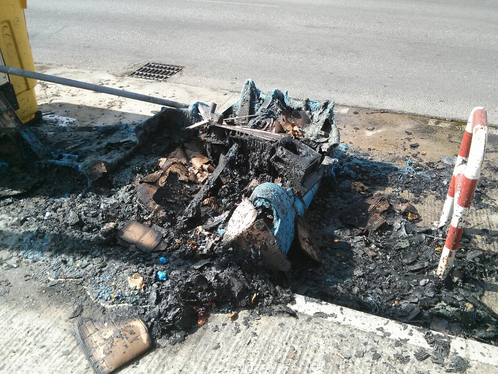 Me ha llamado la atencion ver que algun payaso ha quemado el contenedor reciclaje de papel y carton, la foto en sí no tiene gracia, pero es una foto que compartir. Que mal que haya gente que odie el reciclaje