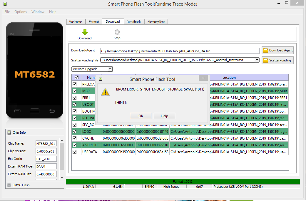 ¿Como lo has instalado ? A mi cuando lo intentaba usando las MTK Tools y la rom que pusieron en un post de abajo me da un error en la instalación , me pone que no hay espacio.