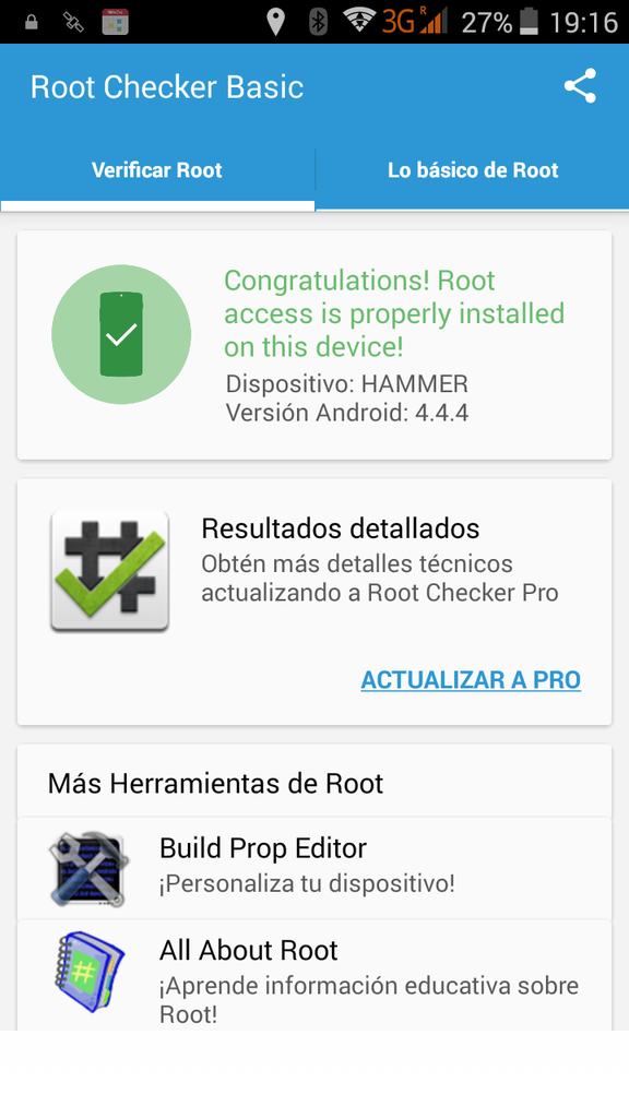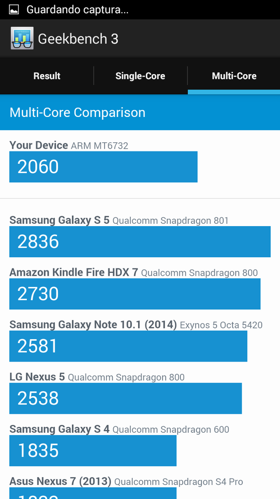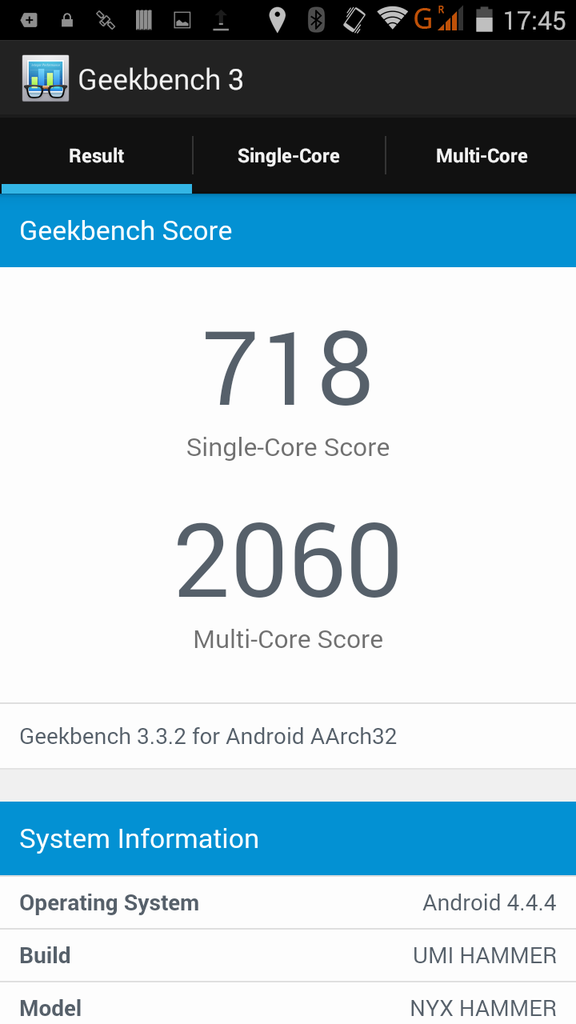 Por suerte esta vez, a faltas de ver cómo se comporta en el tiempo, parece ser que han creado un Smartphone con una relación calidad/precio estupenda. Y es que a este Umi Hammer prácticamente no le falta nada para ser un éxito en ventas. En el interior de este Umi Hammer nos encontramos con: - Procesador de 64 bits que si bien no es lo mejor de la marca, es bastante decente. Se trata del MT6732; Un procesador quadcore que funciona a una velocidad de 1.5 Ghz. - 2 Gb de memoria RAM. - Cámaras de 13 y 3.2 Mpx para el caso de la frontal y doble led principal. - Pantalla IPS con doble laminación protectora a una resolución de 1280 x 720 en 5 pulgadas de diagonal. - Memoria interna de 16 Gb ampliables mediante micro SD. - Dual SIM, 4G con banda 800 y 3G con banda 900. - 2250 mAh de batería. Como veis si bien no es de lo último en la gama media, sí que poseemos como dije al principio un repertorio de características que lo convierten en un interesantísimo terminal. Vamos con el unboxing. La presentación una vez más muy buena como es costumbre de UMI. Nos encontramos con una caja doble, la segunda con apertura tipo librO. Cada accesorio encajado en su respectivo sitio. Eso sí, han querido hacer una caja tan pequeña que han tenido que hacer una caja aparte solo para la carcasa que incluye original. Lo incluido en este caso ha sido: Protector de cristal templado de alta calidad con sus dos mopas. Una de limpieza y otra de secado. Supuestamente se trata de un terminal capaz de aguantar un trato bastante descuidado. La inclusión de este accesorio me hace desconfiar un poco sobre ello. Pero por otro lado es de agradecer. Funda semi rígida con el logotipo de la marca. La primera sensación que da es que es fácilmente rompible. Pero la verdad es que admite bastante bien el retuerzo. El tacto es suave al igual que la tapa trasera y excepto la tapa trasera y las 4 esquinas del terminal, no protege más nada. Ni bordes, ni pantalla al apoyarla en una superficie plana. Cable USB de carga y transferencia de datos. También con una calidad bastante buena. Con los conectores rodeados de una especia de chapa plateada. Cargador con enchufe tipo Europeo con “solo” 1 Amperio de salida. Da la sensación de ser el típico cargador “del chino”. Carga bien y no he notado pitidos ni calentamientos excesivos. Aun así recomiendo encarecidamente la compra de uno de más calidad. Soporte con el logotipo de la marca. Curioso al menos es. Util, no tanto. Va pegado con cinta de doble cara a la parte trasera del móvil. Al pulsar justo en el centro este se tuerce y sirve de apoyo. Luego solo es necesario devolverlo a su forma para que permanezca recogido. Poco más nos vamos a encontrar. Un protector normal ya colocado y unos manuales cierran el pack de accesorios. Es innegable que el diseño no destaca mucho. Pero en cuanto a calidad de construcción, la robustez que transmite provoca envidia entre los gama media (cada vez menos). Unos bordes fabricados en metal, un peso algo elevado y un ensamblado muy muy decente no hace que dudemos del empeño en hacer un terminal de calidad por parte de UMI. En el frontal poco a destacar. Los bordes sobresalen un poco y ceden algo de elegancia al conjunto. En su parte superior nos encontramos con el conjunto de sensores, altavoz frontal y led de notificaciones (Si, tiene). En la parte baja frontal, los botones capacitivos. Esta vez no retroiluminados aunque si bien distinguibles a poco que tengamos un poco de luz. En el borde izquierdo no encontramos absolutamente nada que no sea la típica banda de plástico. Es en el borde derecho donde nos encontramos con los botones de volumen y bloqueo/apagado. La verdad es que el tacto de los mismos es excelente. No bailan en su alojamiento, el recorrido es muy bueno y para nada da la sensación del uso de pulsadores de dudosa calidad. En el borde superior, conector para Jack de 3.5 mm y micro USB. Ambos rodeados por un pequeño borde que agradeceremos al ver que no sufre daños el aluminio mientras atinamos a introducir los conectores. Nos vamos al borde inferior. Aquí como es lógico exceptuando el micrófono poco queda que podamos encontrarnos. En la foto da la sensación de un mal encaje. Pero es efecto de la foto. Queda bastante bien encajada la tapa trasera. Giramos el móvil para ver su parte trasera. Un nuevo logotipo de UMI nos sorprende en un tamaño no descartable. En la parte inferior el modelo que tenemos ante nosotros. Bajo este y un par de frases (Designed by meizu in China/ UMI Technology & Android Smartphone), los orificios del altavoz algo desplazado a la derecha. En la parte superior la cámara sobresale bastante del plano del teléfono. Rodeando el cristal protector de la lente, un borde cromado nos hace pensar que será bastante fácil que acabe arañado. Justo unido al borde nos encontramos el microfono de cancelación de ruido de forma bastante discreta. Junto a la cámara, el doble led. Como ya hemos ido viendo anteriormente, sin tener unas características técnicas punteras, tenemos un dispositivo muy equilibrado en general al que prácticamente no le falta de nada sin llegar a sobresalir en algo. Ya se adelantó en la introducción. El procesador MT6732de mediatek hace que no empecemos con un dispositivo desfasado de antemano. La velocidad máxima de reloj es de 1.5 Ghz. La GPU que acompaña es la MALI t760. Una GPU de última generación que gracias a su doble núcleo y su frecuencia de 500 mhz hará que podamos jugar a prácticamente todo el catálogo de juegos actuales sin problemas. Se ha probado con varios juegos, entre ellos el modern cobat 5, y lo ha movido con una fluidez y una cantidad de frames bastante buena. En cantidad de memoria RAM tampoco queda mal parado. Disponemos de 2 Gb, de los cuales al menos la mitad (depende de su uso) estarán disponibles normalmente. El panel ya lo conocemos también del inicio. Una pantalla de 5 pulgadas con una resolución 720p es lo que nos ofrece 